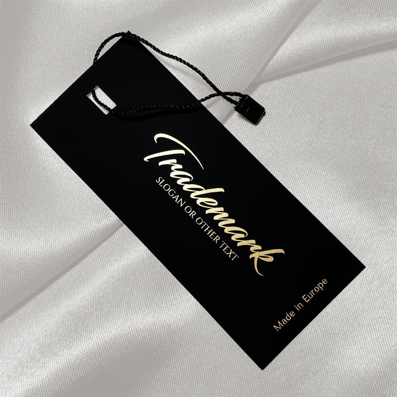 Eticheta cu snur pentru agatat de haine sau de alte produse de imbracaminte, fabricata din carton gros laminat cu folie Soft Touch cu scris auriu. Acest model de eticheta este fabricat din materiale de inalta calitate, utilizand cele mai avansate tehnologii in domeniul tiparului Digital si finisare.