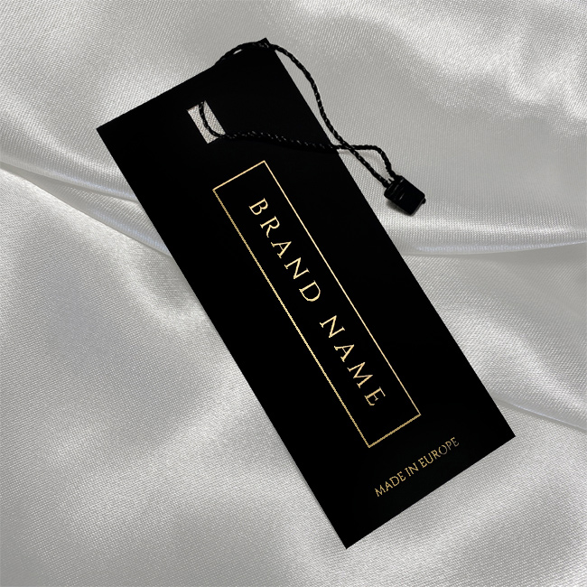 Eticheta din carton cu scris auriu si fundal negru, prevazuta cu snur de prindere la produse de imbracaminte, fabricata din carton gros laminat Soft Touch pe ambele laturi. Acest model de eticheta este fabricat din materiale de inalta calitate, utilizand cele mai avansate tehnologii in domeniul tiparului Digital si finisare.