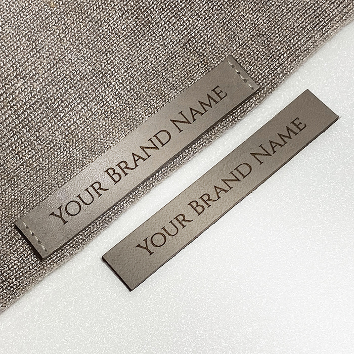 Eticheta din piele naturala model EP-M27 pentru cusut pe haine, hanorace, pulovere, fulare, caciuli si articole vestimentare tip Jeans si blugi, personalizata cu numele si logo brandului. Acest model de eticheta din piele este fabricat din piele naturala de calitate superioara, utilizand utilaje de ultima generatie si metode profesionale de gravura laser sau embosare.