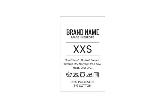 Eticheta tehnica care contine informatii despre compozitia materialului, instructiuni de spalare si intretinere, numele producatorului si tara de fabricare. Acest model de eticheta textila este fabricat utilizand cele mai avansate tehnologii in domeniul imprimarii digitale pe suport textil. Etichetele sunt imprimate pe satin special prin metoda transfer termic, cu o calitate impresionanta a tiparului si rezistenta ridicata la spalare. Etichetele imprimate sunt taiate automat, conform dimensiunilor prezentate.