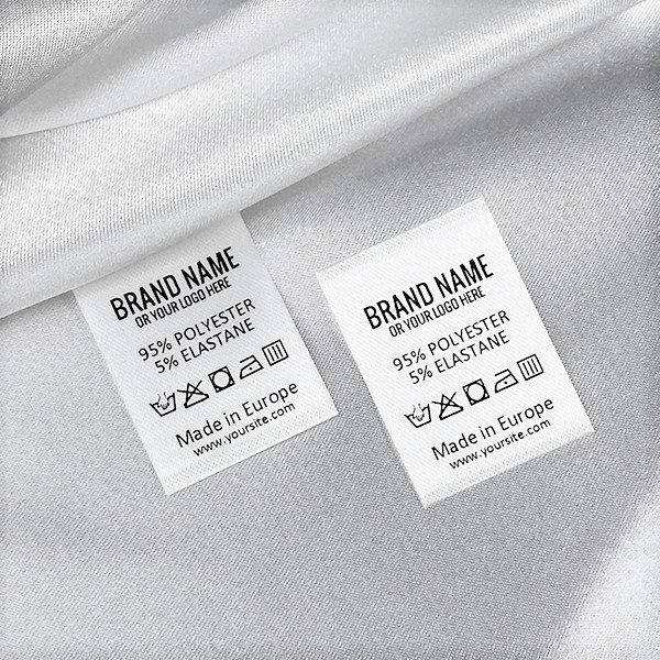 Eticheta de compozitie personalizata cu denumirea brandului, compozitia tesaturilor, simboluri de spalare si ingrijire, tiparite pe satin alb si taiata cu ultrasunete la margini. Acest model de eticheta textila este fabricat utilizand cele mai avansate tehnologii in domeniul imprimarii digitale pe suport textil. Etichetele sunt imprimate pe satin special prin metoda transfer termic, cu o calitate impresionanta a tiparului si rezistenta ridicata la spalare. Etichetele imprimate sunt taiate automat, conform dimensiunilor prezentate.