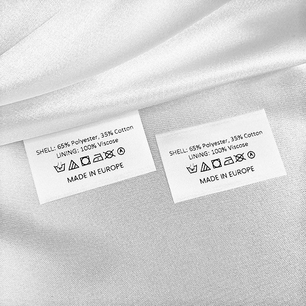 Eticheta cu simboluri de spalare si ingrijire, si informatii despre compozitia materialului personalizata pe un satin fin de calitate superioara, taiat la cald cu ultrasunete. Acest model de eticheta textila este fabricat utilizand cele mai avansate tehnologii in domeniul imprimarii digitale pe suport textil. Etichetele sunt imprimate pe satin special prin metoda transfer termic, cu o calitate impresionanta a tiparului si rezistenta ridicata la spalare. Etichetele imprimate sunt taiate automat, conform dimensiunilor prezentate.