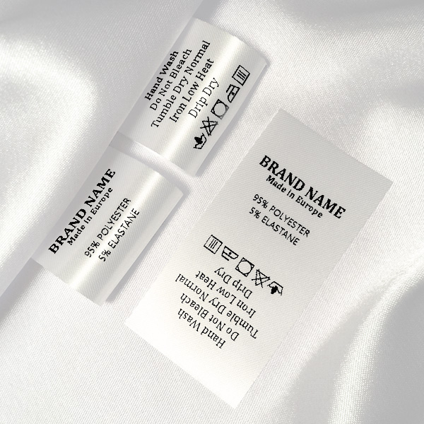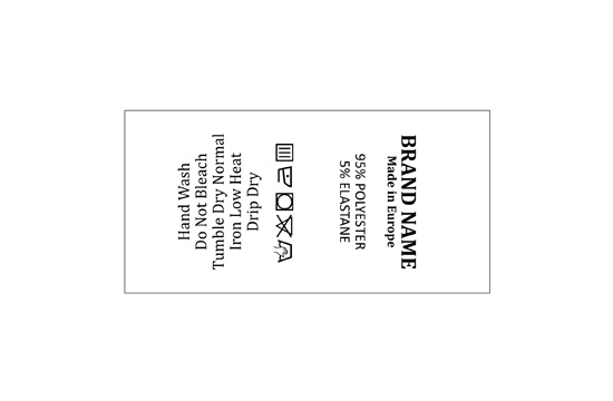 Eticheta compozitie pentru imbracaminte, personalizata cu texte de culoarea neagra imprimate pe satin alb cu o textura fina. Acest model de eticheta textila este fabricat utilizand cele mai avansate tehnologii in domeniul imprimarii digitale pe suport textil. Etichetele sunt imprimate pe satin special prin metoda transfer termic, cu o calitate impresionanta a tiparului si rezistenta ridicata la spalare. Etichetele imprimate sunt taiate automat, conform dimensiunilor prezentate.